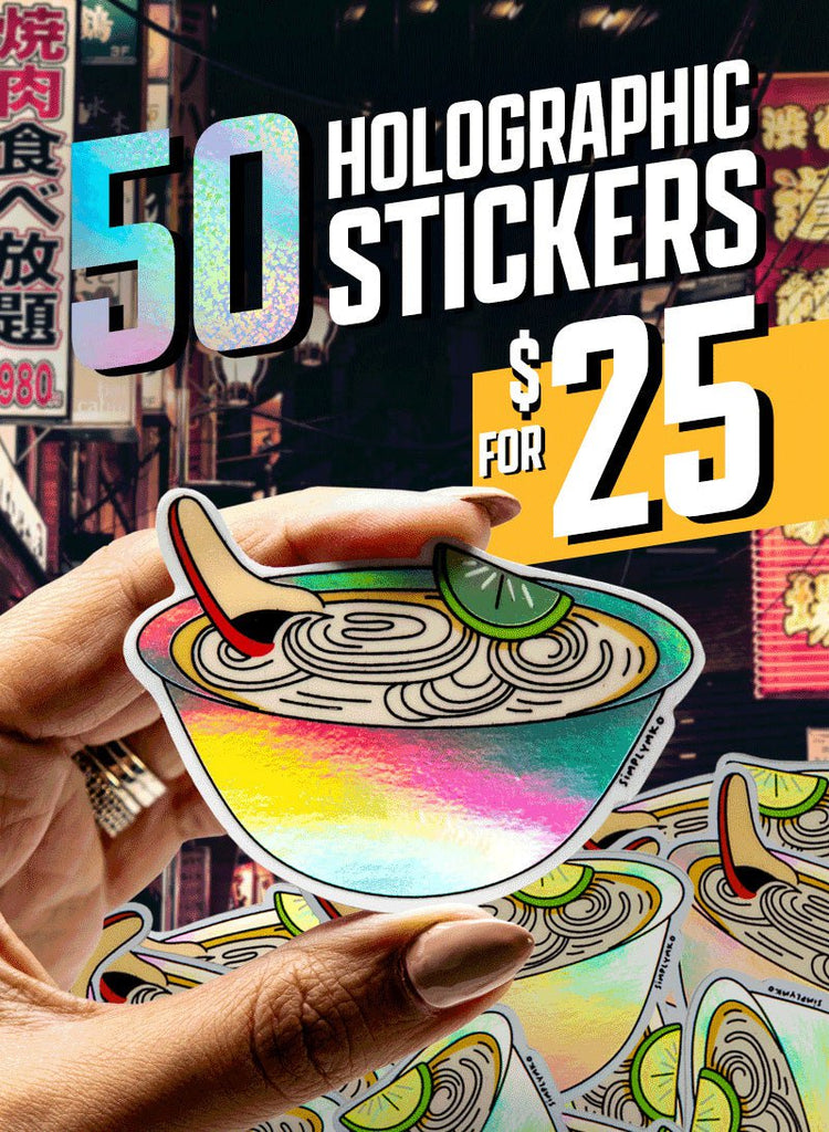 Promotional graphic for 50 holographic stickers for 25 dollars. A hand holds a holographic sticker shaped like a bowl of ramen with swirling noodles, a lime wedge, chopsticks, and a rainbow-reflective bottom half. Background shows a nighttime city street with illuminated Japanese signs. Large text on the graphic reads 50 holographic stickers for 25 dollars.